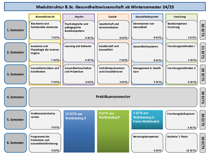 Um die Gesundheit des Menschen ressourcenorientiert und unter Berücksichtigung der interagierenden Kontextfaktoren verstehen zu können, berücksichtigt der Bachelorstudiengang Gesundheitswissenschaft mit seiner Struktur bio-(medizinisch)-psycho-soziale Aspekte der Gesundheitswissenschaft (nach ICF), Fragen der Epidemiologie und der Strukturen des Gesundheitssystems. Dabei beinhaltet er gleichzeitig ein großes Repertoire an Forschungsmethoden für wissenschaftliches Arbeiten. Dies wird auch in der Säulenstruktur abgebildet, die - bezogen auf die Studiensemester - eine Matrix ergibt: die ersten drei Säulen stellen die bio-psycho-soziale Perspektive nach ICF dar und werden durch Wissensbereiche der Medizin ergänzt, die in der bio-(medizinischen) Säule auch die Sichtweise der ICD vermittelt, um so die Anschlussfähigkeit zu medizinisch geprägten Diskursen sicherzustellen. In der sozialen Säule werden vorrangig Aspekte der gesellschaftlichen Einbindung fokussiert (Lebenslagenansatz) und die psychologische Säule berücksichtigt Aspekte beider Klassifikationen, vor allem aber die Fähigkeit der psychischen Steuerung (Agency).